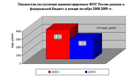 Всего в январе-октябре 2009 года в федеральный бюджет поступило 2 472,1 млрд. рублей администрируемых доходов, что на 32% меньше, чем в январе-октябре 2008 года.