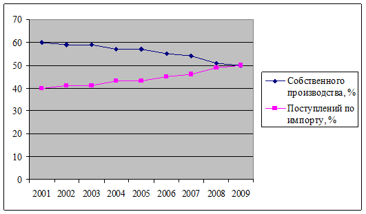 По данным Федеральной службы государственной статистики, число крупных и средних хозяйствующих субъектов изменилось с 69,4 тысяч в 2005 году до 47,3 тысяч в 2009 году. За указанный период их число ежегодно уменьшалось на 9%. При этом доля товаров российского производства в общем товарообороте постепенно снижается (таблица 8, рис. 6).