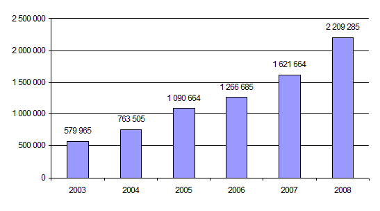 Диаграмма, представленная на рисунке 4, наглядно демонстрирует рост налоговых поступлений в республиканский бюджет из года в год. Так с 2003 года налоговые поступления в республиканский бюджет увеличились более чем в 3 раза. Сумма налоговых поступлений в республиканский бюджет в 2008 г. на 36% превышают показатель 2006 года.
