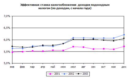 Рост поступлений по подоходному налогу был обусловлен в 2003 году опережающим ростом доходов населения, приведшим к их увеличению по отношению к ВВП на 3,6 процентных пункта по сравнению с 2002 годом. Положительный эффект на сборы подоходного налога от выхода части заработной платы из тени исчерпался в 2002 году. В пользу этого заключения свидетельствует тот факт, что эффективная ставка налогообложения доходов населения подоходным налогом, определяемая как отношение сборов этого налога к объёму налогооблагаемых доходов населения или к зарплате в экономике, осталась практически на уровне 2002 года с незначительным снижением во второй половине 2003 года.