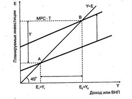 Рис.6. Мультипликативное влияние изменения налогов на равновесный уровень дохода