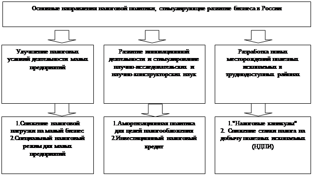 Исходя из Бюджетного послания Президента РФ Федеральному Собранию РФ "Основные направления и ориентиры бюджетной политики в 2009-2011годах" можно выделить три основных направления налоговой политике в ближайшие годы, стимулирующие развитие бизнеса в России (Рис.9). Для улучшения налоговых условий деятельности малых предприятий используется снижение налоговой нагрузки на них (это особенно актуально в условиях финансового мирового кризиса): " Снижение налоговой нагрузки - оптимальная основа для резкого повышения предпринимательской активности в стране. Таким образом, государство дает производителям возможность максимально эффективно использовать свои активы в условиях финансового кризиса", - подчеркнул, оценивая принятые поправки, представитель думского комитета по экономической политике и предпринимательству Олег Валенчук.