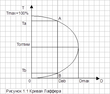 Общей схемой повышения эффективности налоговой системы является Оптимизация налоговой нагрузки по Лафферу. Американский экономист Лаффер выявил закономерность, характеризующую связь между налоговой нагрузкой предприятий и доходами государства. По мере роста налоговых ставок (Т) от нуля до 100 процентов (Рисунок 1.1) налоговые поступления (D) растут от нуля до определённого максимального уровня (Dmax), после чего налоговые поступления начинают снижаться до ноля.