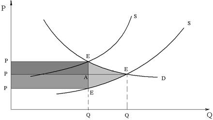 Кривая S (кривая предложения до введения налога) связывает объем предложения с ценой, остающейся у продавца после уплаты налога; S1 – кривая, устанавливающая связь между объемом предложения и ценой, уплачиваемой покупателем, - кривая предложения после введения налога. Кривая S1 получена из кривой S смещением на Т единиц в направлении оси цен (вверх). Введение налога вызвало перемещение равновесия из точки Е0 в точку Е1, при этом объем продаж сократился с Q0 до Q1, цена, уплачиваемая покупателем, выросла с Р0 до P1, а получаемая продавцом - снизилась с Р0 до Р1*. Выгода от покупки-продажи снизилась и для покупателя, и для продавца. Излишек потребителя снизился и из-за того, что за каждую единицу покупаемого товара он вынужден платить больше, и из-за того, что ему при этом приходится сокращать объем потребления, а часть потребителей, возможно, вообще откажется от покупки данного товара. Воспользовавшись геометрическим представлением излишка потребителей, мы можем уменьшение его величины изобразить площадью фигуры P1E1E0P0. Продавец получает за каждую единицу товара меньше, чем до введения налога, и к тому же сокращается объем продаж; часть продавцов, возможно, будет вынуждена покинуть данный рынок. Сокращение их излишка представлено на рис. 2 площадью фигуры Р0Е0Е1*Р1*. Суммарному сокращению излишков покупателей и продавцов (т.е. величине налогового бремени) соответствует площадь фигуры Р1Е1Е0Е1*Р1*. Распределению налогового бремени между продавцом и покупателем соответствует отношение площадей фигур P1E1АP0 и Р0АЕ1*Р1* соответственно. А отношение это, как видно из графика, зависит от наклонов линий спроса и предложения, т.е. от ценовой эластичности спроса и предложения. Площадь треугольной области Е1Е0Е1* не покрывается величиной налогового сбора. Это чистые потери общества, обусловленные введением налога.[1, с.61]