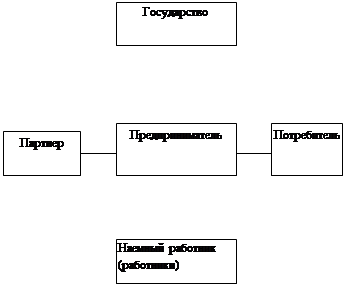 Основным субъектом предпринимательской активности выступает предприниматель. Однако предприниматель — не единственный субъект, в любом случае он вынужден взаимодействовать с потребителем как основным его контрагентом, а также с государством, которое в различных ситуациях может выступать в качестве помощника или противника. И потребитель и государство также относятся к категории субъектов предпринимательской активности, как и наемный работник (если, конечно, предприниматель работает не в одиночку), и партнеры по бизнесу (если производство не носит изолированного от общественных связей характера) (рис. 1).