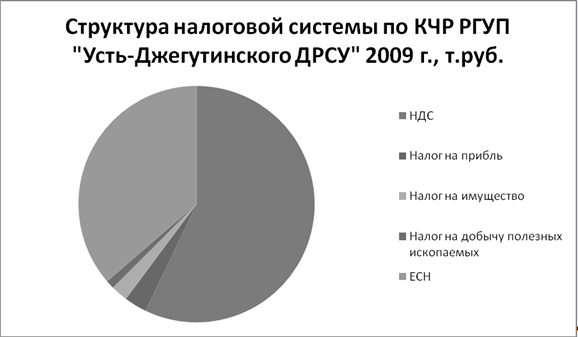 В 2009 году предприятие "Усть-Джегутинский ДРСУч" значительно увеличилось ремонт и содержание дорог, так же произошло становление новых партнерских отношений, что послужило причиной увеличения налога на добавленную стоимость на 181,7 тыс.руб., предприятие получило больше прибыли чем в 2008 году, поэтому сумма налога на прибыль увеличилась на 181,7 тыс.руб., так же была продано несколько транспортов в связи с этим сумма налога на имущество снизилась на 2,5 тыс.руб.,