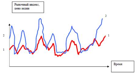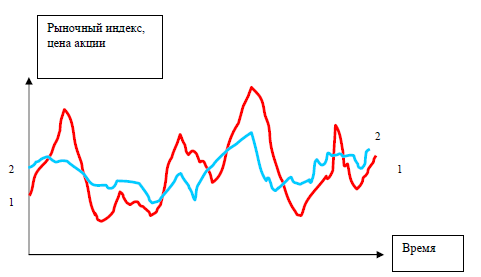 Рис. 2: красный цвет (1)– динамика соответствующего рыночного индекса; синий цвет (2)– ценовая динамика акций крупной корпорации компании
