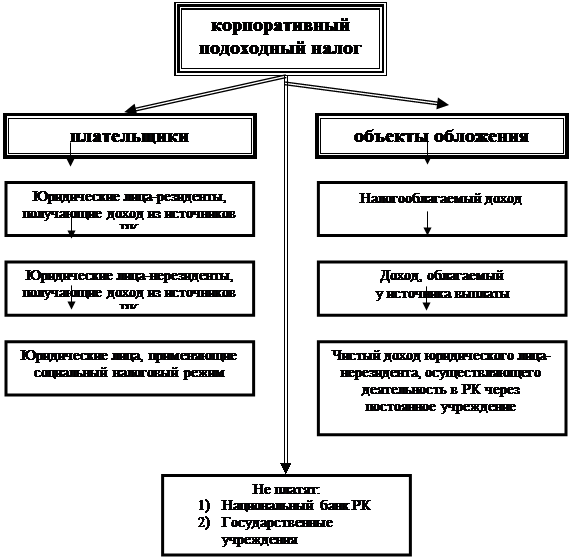 В новом Налоговом Кодексе РК введено понятие, корпоративный подоходный налог, представим механизм действия и особенности рисунок 4. Как видно из рисунка 4, одним из важных понятий, лежащих в основе деления данного вида налога, является резидентство, которое подразумевает конечную налоговую ответственность юридического лица по месту нахождения, т.е. на территории РК. При этом резиденты налоговой юрисдикции (территории, внутри которой действуют соответствующие налоговые законы) облагаются налогами на все доходы из всех источников, включая и зарубежные источники доходов.