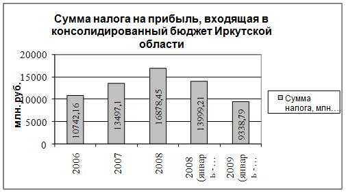 Объем поступлений налога на прибыль в 2007 г. в консолидированный бюджет Иркутской области составил 13497,1 млн. руб. Сборы налога выросли на 2754,94 млн. руб., что на 25,6 % выше, чем в 2006 г.(10742,16 млн. руб.). В структуре доходов бюджета наблюдается наоборот небольшое снижение на 0,8% и составляет 20,5% от доходов бюджета (в 2006 г. 21.3%). В 2008 г. также наблюдается рост налога на прибыль на 3381,35 млн. руб. и составляет 16878,45 млн. руб., это на 25% больше, чем в предыдущем году. В структуре доходов консолидированного бюджета Иркутской области наблюдается небольшое снижение данной статьи на 0,2% (составляет 20,2%), чем в 2006 г.