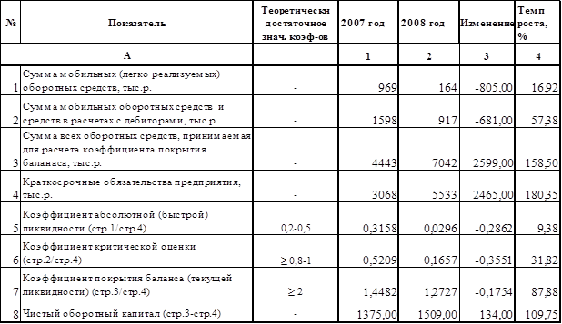 Коэффициент текущей ликвидности предприятия на начало анализируемого периода составил 1,45, а в 2008 году он составил 1,27, что меньше допустимого уровня. Необходимо отметить, что значение коэффициента текущей ликвидности близко к нормативу.