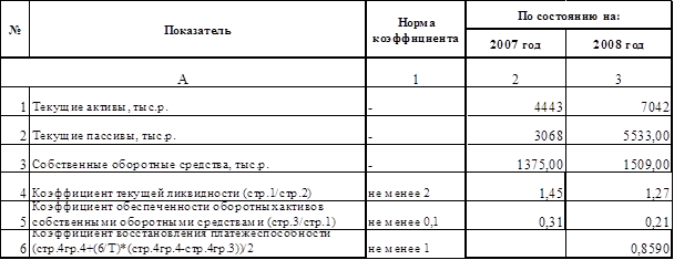 Превышает норму коэффициент обеспеченности оборотных активов собственными оборотными средствами, который составил 0,31 в 2007 году, а к концу 2008 года понизился до 0,21