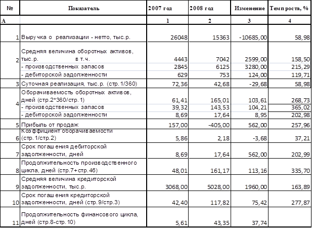 Показатель продолжительности финансового цикла в 2007 году имел положительное значение, что объясняется длительным сроком погашения кредиторской задолженности, в 2008 году ситуация продолжила изменяться в благоприятную для предприятия сторону. Таким образом, время, в течение которого финансовые ресурсы отвлечены из оборота, существенно сократилось.
