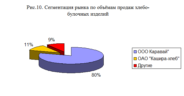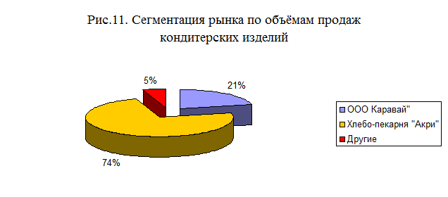 По хлебо – булочным изделиям ООО «Каравай» охватывает 80 % рынка сбыта (рис.10). Основным конкурентом по кондитерским изделиям является хлебо – пекарня «Акри» (рис.11).