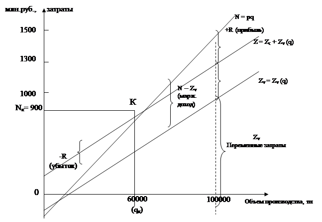 Проведенные расчеты показали, что объем производства продукции (100000 тонн) далек от критического значения (60000 тонн). Критический объем реализации значительно ниже фактического на 600 млн.руб.