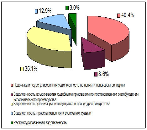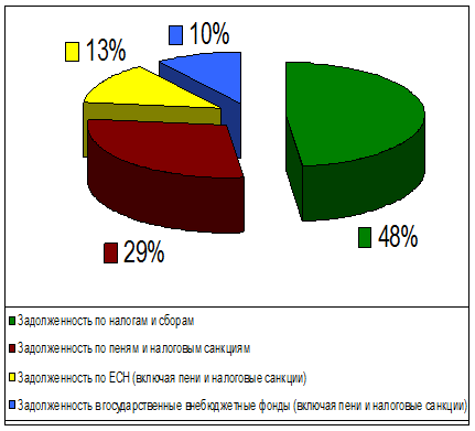 Рис. 3 Структура совокупной задолженности по обязательным платежам (налоги, сборы, платежи в государственные внебюджетные фонды, пени, штрафные санкции) по состоянию на 01.01.2009 г., в %