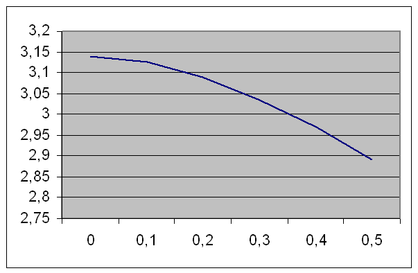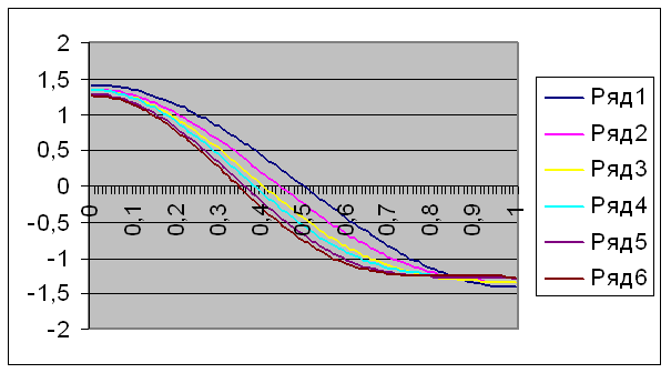 В данной работе были найдены собственные значения и собственные функции для колебаний в трубе при наличии осевого градиента температуры для пяти значений έ. На рис.2 показана зависимость квадратного корня из собственного числа от e. Видно, что с увеличением έ происходит уменьшение собственных чисел задачи. На рис.3 показано распределение давления по длине трубы при различных e. Можно сказать, что с увеличением έ происходит понижение абсолютного значения собственной функции, а также смещение нуля функции в сторону меньших x. Сдвиг нуля функции влево увеличивается с ростом έ.