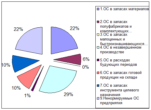 Исходя из диаграммы, видно, что основу ОС предприятия составляют материальные запасы, незавершенное производство, а также ненормируемые ОС. Чтобы снизить оборотные фонды, необходимо найти пути понижения этих статей.