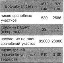 Период земской медицины характеризуется развитием и оптимизацией системы медицинского обслуживания на селе: ростом числа врачей и врачебных участков, уменьшением среднего радиуса врачебного участка и количества обслуживаемого населения. С 1865 по 1870 годы количество врачей увеличилось в 12,7 раза, а с 1870 по 1920 годы — в 5,1 раза. С 1870 года по 1920 год в 5 раз увеличилось количество врачебных участков и, соответственно, в 3,4 раза уменьшилось количество обслуживаемого населения на одном врачебном участке, и в 2,3 раза уменьшился радиус врачебного участка (таблица 1).
