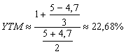 Таким образом, предприятие сможет привлечь долгосрочный заемный капитал по цене 16,924% годовых. Вычисление YTM требует использования компьютера или специальных таблиц – книг доходности. Однако, для нахождения приближенной величины полной доходности можно воспользоваться упрощенной формулой (5.2.3). В качестве параметра CF в этом выражении указывается сумма годового купона (1 тыс. руб. в нашем примере), буквой N обозначается номинал облигации (5 тыс. руб.), а буквой P – ее продажная цена, уменьшенная на сумму расходов по размещению (4,7 тыс. руб.). Переменная n означает срок облигации (в нашем примере 3 года). Подставив эти значения в формулу (5.2.3), получим:
