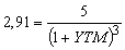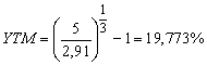 Предположим, что вместо эмиссии купонной облигации, предприятие предпочтет разместить дисконтный инструмент с таким же номиналом и на аналогичный срок. Первичная продажа облигаций будет производиться по курсу 60, а через три года предприятие вернет инвесторам номинальную стоимость облигаций. Расходы по эмиссии составят те же 3% от фактической выручки. То есть, в нулевом периоде предприятие получит 2,91 тыс. рублей (5 * 0,6 * 0,97), а в конце третьего года должно будет заплатить 5 тыс. рублей. Применив формулу, получим: