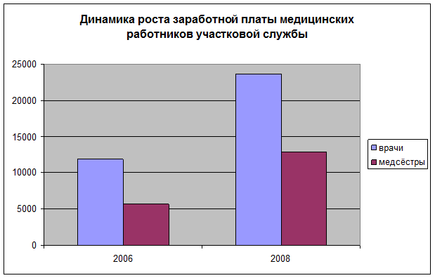 Динамика роста заработной платы медицинских работников участковой службы: врачей: 11 890 руб. – на 01.01.2006, 23 610 – на 01.01.2008, среднего медицинского персонала - 5 694 руб. – на 01.01.2006, 12 851 – на 01.01.2008 (рисунок 2).