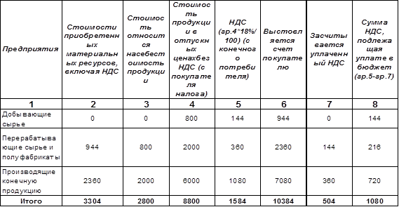 Из таблицы видно, что сумма налога, уплаченного в бюджет всеми тремя предприятиями, гр.8(144+216+720) равна сумме налога, полученного предприятием 3с конечного потребителя гр.5 (1080) или разности между суммой полученного с покупателя налога гр. 5 (1584) и уплаченного поставщикам гр. 7 (504).