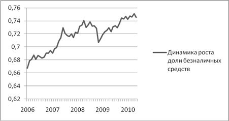 На основании данных представленных на сайте ЦБ РФ построим таблицу денежной массы М2 представленную в приложении 1. В таблице рассчитана доля безналичных средств в общей денежной массе в период с 2007 по май 2010 года включительно. Как мы видим из таблицы – доля безналичных денежных средств всегда больше 50% по отношению к наличным деньгам, что означает, что безналичные средства используются в большем количестве чем наличные деньги.