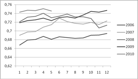Если рассматривать каждый год в отдельности, то так же видна тенденция роста использования безналичных средств (рисунок 3). С каждым годом доля безналичных средств растет по отношению к предыдущим годам, исключением является только 2008 год в котором произошел значительный спад. Это можно объяснить финансовым кризисом 2008 года, когда первым признаком начинающегося кризиса в России стал понижающий тренд на российских фондовых рынках в конце мая 2008 года, который перешёл в обвал котировок в конце июля. Из графика видно, что первый спад в 2008 году был в мае. В октябре — ноябре 2008 года начался резкий спад промышленного производства, первая волна сокращений рабочих мест, кризис ликвидности в российских банках, резкое падение биржевых индексов РТС и ММВБ, падение цен на экспортную продукцию (сырьё и металл). В тоже время из рисунка 3 видно, что резкий спад произошел именно в октябре, это связано с тем, что на фоне падения мировых цен на сырье российские экспортноориентированные корпорации стали уводить заработанные активы за рубеж.