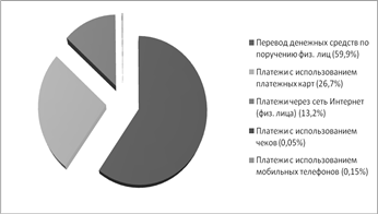 рис 4. Соотношение объемов операций, совершенных с использованием различных платежных инструментов.