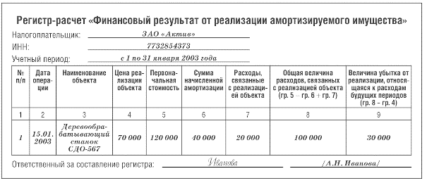 15 января 2006 года ООО "Актив" продало деревообрабатывающий станок за 70 000 руб. (без НДС). Первоначальная стоимость станка - 120 000 руб., сумма начисленной амортизации к моменту продажи - 40 000 руб. Расходы, связанные с продажей станка, составили 20 000 руб.