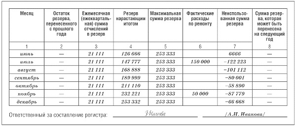 Рисунок 6 - Регистр учета резерва на ремонт основных средств.
