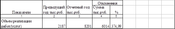 На основании данных таблицы мы видим, что динамика роста объема реализации работ услуг предусматривает увеличение выручки за 2007 г. по сравнению с 2006 на 6014 тыс. рублей, что составляет 374.99 %. Далее мы рассмотрим по каким видам деятельности произошло наибольшее увеличение объемов реализации.