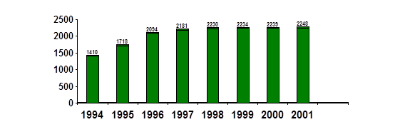 С 1994 года территориальные органы Федерального казначейства стали сначала в порядке эксперимента, а затем на постоянной основе, вести учет и распределение федеральных доходов. С начала 1995 года казначейские органы в 20 субъектах Федерации работали с доходной частью бюджета, обеспечивая ежедневное расщепление и зачисление в каждый из уровней бюджетной системы причитающейся квоты. В 1997 году проделана большая организаторская работа по переводу всех бюджетополучателей из коммерческих банков в казначейство. В целом ситуация по становлению и развитию органов Федерального казначейства представлена в таблице 1.2 и на рисунке 1.5.