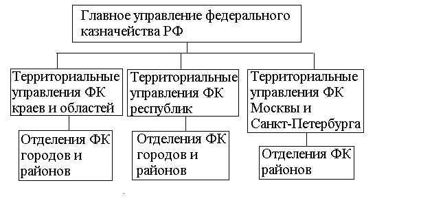 К федеральному уровню относится Главное Управление федерального казначейства Министерства финансов Российской Федерации. Оно является органом управления всей казначейской системой и ему подчинены все нижестоящие территориальные органы казначейства ( рис. 1.2.1 ).