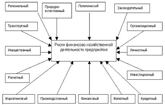 Рис.1.2. Система финансовых рисков Производственные риски - риски, связанные с убытком от остановки производства вследствие воздействия различных факторов и прежде всего с гибелью или повреждением основных и оборотных фондов (оборудование, сырье, транспорт и т.п.), а также риски, связанные с внедрением в производство новой техники и технологии.Торговые риски представляют собой риски, связанные с убытком по причине задержки платежей, отказа от платежа в период транспортировки товара, непоставки товара и т.п.Финансовые риски связаны с вероятностью потерь финансовых ресурсов (т.е. денежных средств).Финансовые риски подразделяются на два вида: риски, связанные с покупательной способностью денег, и риски, связанные с вложением капитала (инвестиционные риски).В зависимости от основной причины возникновения рисков (базисный или природный риск) они делятся на следующие категории: природно-естественные риски, экологические, политические, транспортные, коммерческие риски.К природно-естественньм рискам относятся риски, связанные с проявлением стихийных сил природы: землетрясение, наводнение, буря, пожар, эпидемия и т.п.Экологические риски - это риски, связанные с загрязнением окружающей среды.Политические риски связаны с политической ситуацией в стране и деятельностью государства.К политическим рискам относятся:· невозможность осуществления хозяйственной деятельности вследствие военных действий, революции, обострения внутриполитической ситуации в стране, национализации, конфискации товаров и предприятий, введения эмбарго, из-за отказа нового правительства выполнять принятые предшественниками обязательства и т.п.;· введение отсрочки (моратория) на внешние платежи на определенный срок ввиду наступления чрезвычайных обстоятельств (забастовка, война и т.д.);· неблагоприятное изменение налогового законодательства;· запрет или ограничение конверсии национальной валюты в валюту платежа. В этом случае обязательство перед экспортерами может быть выполнено в национальной валюте, имеющей ограниченную сферу применения.Транспортные риски - это риски, связанные с перевозками грузов транспортом: автомобильным, морским, речным, железнодорожным, самолетами и т.д.К рискам, связанным с покупательной способностью денег, относятся следующие разновидности рисков: инфляционные и дефляционные риски, валютные риски, риски ликвидности.Инфляция означает обесценение денег и, естественно, рост цен. Дефляция - это процесс, обратный инфляции, выражается в снижении цен и соответственно в увеличении покупательной способности денег.Инфляционный риск - это риск того, что при росте инфляции получаемые денежные доходы обесцениваются с точки зрения реальной покупательной способности быстрее, чем растут. В таких условиях предприниматель несет реальные потери.Дефляционный риск - это риск того, что при росте дефляции происходят падение уровня цен, ухудшение экономических условий предпринимательства и снижение доходов.Валютные риски представляют собой опасность валютных потерь, связанных с изменением курса одной иностранной валюты по отношению к другой, при проведении внешнеэкономических, кредитных и других валютных операций.Риски ликвидности - это риски, связанные с возможностью потерь при реализации ценных бумаг или других товаров из-за изм