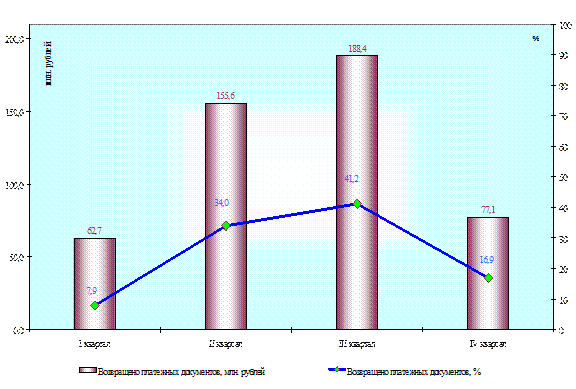 Анализ результатов финансового контроля показал, что наибольшая сумма пришлась на платежные документы, возвращенные клиентам во 2 и 3 кварталах, – 155,6 млн. рублей и 188,4 млн. рублей соответственно, что составило 34 и 41,2% (Рис.6).