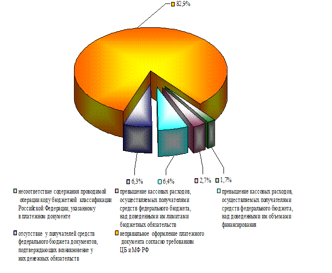 По видам нарушений наибольшая сумма пришлась на платежные документы, возвращенные по причине неправильного их оформления согласно требованиям Центрального Банка и Минфина РФ, – 379,3 млн. рублей или 82,9% от общей суммы не принятых платежных документов, наименьшая – на платежные документы, возвращенные по причине несоответствия содержания проводимой операции коду бюджетной классификации РФ, указанному в платежном документе, – 7,6 млн. рублей или 1,7%. Из-за превышения кассовых расходов, осуществляемых получателями средств федерального бюджета, над доведенными им лимитами бюджетных обязательств, возвращено платежных документов на 12,3 млн. рублей или 2,7%, из-за превышения кассовых расходов над доведенными им объемами финансирования, – 29,4 млн. рублей или 6,4%, из-за отсутствия у получателя документов, подтверждающих возникновение у него денежных обязательств, – 28,7 млн. рублей или 6,3% (Рис.7).