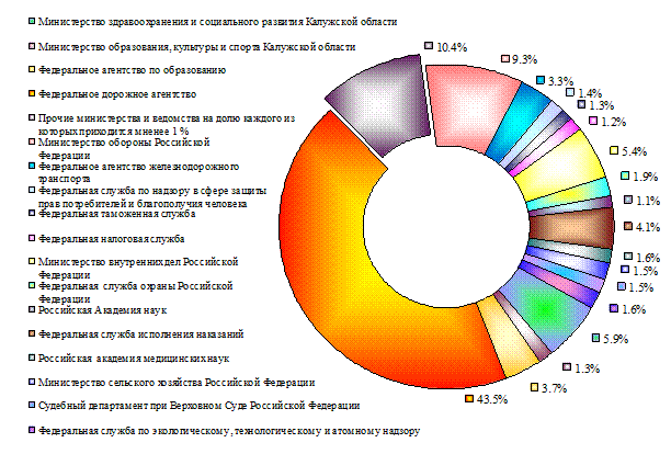 В разрезе ведомственной подчиненности получателей средств федерального бюджета, в том числе, выделенных в порядке межбюджетных отношений в виде субсидий и субвенций, наибольший удельный вес суммы нарушений пришелся на учреждения: Федерального дорожного агентства – 43,5%, Министерства обороны РФ – 9,3%, Министерства внутренних дел РФ – 5,4%, Федеральной службы исполнения наказаний – 4,1%, Федерального агентства по образованию – 3,7%, а также на Министерство здравоохранения и социального развития Калужской области – 5,9% (Рис.8).