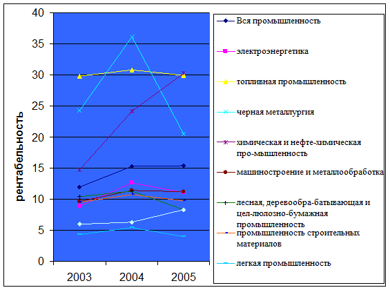 Следующим этапом будет анализ рентабельности предприятий (табл. 2.6 и рис 2.2). По данным диаграммы можно сказать, что средняя рентабельность предприятий на уровне 15 %, при этом сформирована она за счет топливной, химической и нефтехимической промышленности и черной металлургии. Кроме того, следует отметить, что рентабельность черной металлургии имеет тенденцию к снижению, следовательно, возможно снижение общей рентабельности в промышленности. Сопоставив рис 2.2 и табл. 2.5 можно отметить, что предприятия энергетики при рентабельности ниже среднего уровня приносят 30 % всей прибыли, это говорит о том, что необходимо привлекать инвестиции для снижения себестоимости продукции (следует разграничить субсидии и инвестиции).