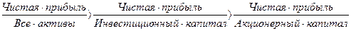 Первая группа показателей рентабельности формируется как отношение прибыли к различным показателям авансированных средств, из которых наиболее важными являются; все активы предприятия; инвестиционный капитал (собственные средства + долгосрочные обязательства); акционерный (собственный) капитал :