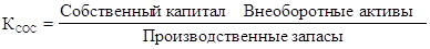 Коэффициент обеспеченности запасов собственными источниками финансирования характеризует степень покрытия запасов (сырьё и материалы) и затрат (незавершенное производство, авансы поставщикам) собственными источниками финансирования. Для финансово устойчивого предприятия величина коэффициента должна превышать 1.