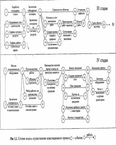 Прежде чем рассматривать стадии реализации проекта, напомним, что любой инвестиционный проект, вне зависимости от его объемов, сложности, условий инвестирования, должен осуществляться в соответствии с выбранной технологией. Под технологией понимается последовательность определенных действий, направленных на получение промежуточного или конечного результата, в качестве которых в нашем случае могут выступать: подготовка технико-экономического обоснования проекта; разработка рабочей проектно-сметной документации; строительство (реконструкция); монтаж технологического оборудования и выпуск опытной партии продукции; выпуск продукции. На рис. 1 показана сетевая модель (сетевой график) осуществления проекта, которая содержит ряд характеристик (время, стоимость, ресурсы и др.), относящихся как к отдельным работам, так и к проекту в целом. Сетевой график наиболее нагляден, а цифровое представление наиболее удобно для анализа сетей с помощью компьютерной техники.