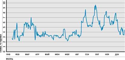 Розничный кредит растет опережающими темпами по сравнению с депозитами физлиц. В то же время население остается нетто-кредитором: по состоянию на 1 ноября 2007 г. вклады физлиц (4,7 трлн руб., или 189,5 млрд долл.) превышали кредиты физлицам (3,0 трлн руб., или 122,4 млрд долл.) в 1,5 раза (рис. 3.2.7). Банки вошли в зону турбулентности. Хотя Россия и находится на периферии мирового финансового рынка, двойной кризис (глобальный кризис ликвидности и кризис ипотеки sub-prime в США) существенно влияет на деятельность российских банков. Основное следствие глобального кризиса ликвидности для российского финансового рынка - дефицит ликвидности, проявляющийся, в частности, в росте ставок МБК, особенно в налоговые периоды (рис. 3.2.8).