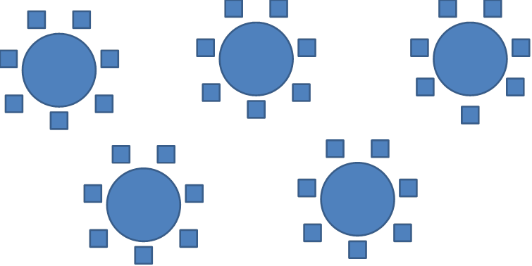 Рассадка гостей представляет собой 7 круглых столов по 5 человек за каждым, как показано на рисунке 3.1.