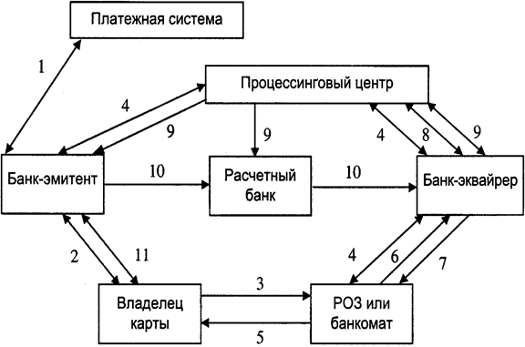 5. В случае успешного завершения процедуры авторизации POS-терминал или банкомат списывает сумму сделки с банковской карты и выдает держателю карты слип; банковская карта возвращается владельцу карты.