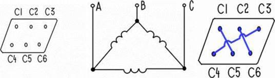 начала обмоток С1, С2 и С3, концы, соответственно С4, С5 и С6 (крайний левый рисунок).