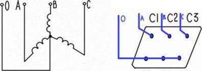 Имеются три схемы включения трехфазной нагрузки в сеть. В частности, на корпусах электродвигателей имеется контактная коробка с выводами обмоток. Маркировка в клеммных коробках электрических машин следующая: