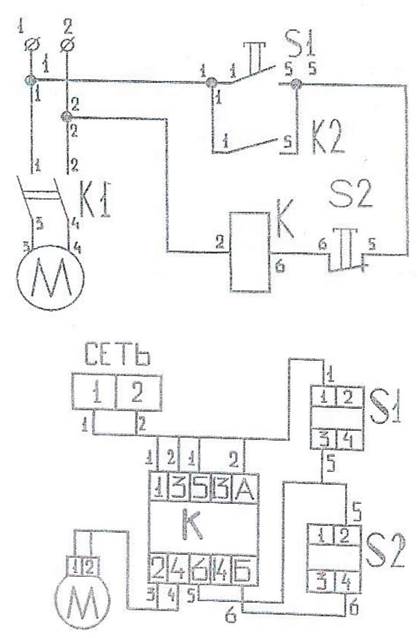 Для включения машины используем контакты реле «К» и кнопку S1. При нажатии на кнопку цепь катушки реле «К» получает питание и контакты реле К1 и К2 замыкаются. Двигатель получает питание и работает. Но, отпустив кнопку, схема перестает работать. Поэтому один из контактов реле «К» используем для шунтирования кнопки. Теперь, после размыкания контакта кнопки, реле не теряет питание, а продолжает удерживать свои контакты в замкнутом положении. И для выключения схемы используем кнопку S2. Правильно собранная схема после отключения сети не включится до тех пор, пока человек не даст на это команду.