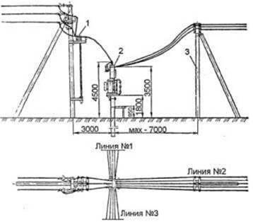 Рис. 1.2. Схема присоединения ВЛ 10(6) и 0,38 кВ в комплектной трансформаторной подстанции 10/0,4 кВ 1 - разъединитель; 2 - КТП; 3 - концевая опора ВЛ 380. |