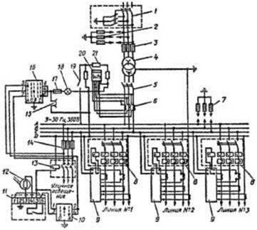Рис. 1.3. Электрическая схема КТП З мощностью 63,100 и 160 к В Л с защитой ЗТИ- 0,4УЗ 1 - разъединитель РЛНД; 2,7 - разрядники РВО-10 и РВН- 1У1; 3 - предохранитель ПК-10; 4 - трансформатор ТМ- 10/0,4 кВ; 5 - рубильник Р-32УЗ; 6 - трансформатор тока ТК-20УЗ; 8 - автоматические выключатели АЕ-2058-32; 9 - защитные приставки ЗТИ-0.4УЗ; 10 - переключатель ПК 10-1-2-П; 11 - фотореле ФР-2; 12 - фоторезистор ФСК- П; 13 - магнитный пускатель ПМЕ-211; 14,17 - предохранители Е-27, П-25/3 80УЗ; 15 - штепсельная розетка; 16 - переключатель ПМОФ-45; 18 - лампа накаливания НВ27; 19 - выключатель на 6 А; 20 - счетчик САЧУ-И672М; 21 - резистор ПЭ-75 |